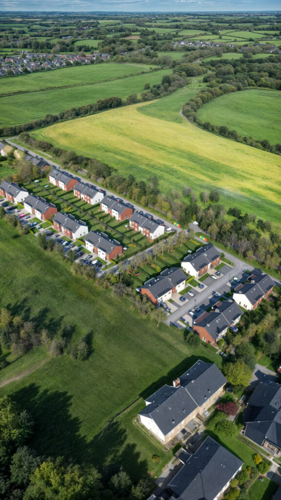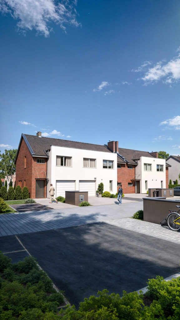 Współpraca z deweloperem. Fotorealistyczne wizualizacje 3D osiedla deweloperskiego pod Poznaniem, ukazujące nowoczesną architekturę. Nasze wizualizacje pomagają deweloperom w skutecznej prezentacji inwestycji, ukazując przestrzeń zieloną oraz widok z lotu ptaka na osiedle. Projektowanie w technologii 3D umożliwia dokładne odwzorowanie wszystkich detali, co ułatwia decyzje inwestycyjne i szybszą sprzedaż mieszkań.