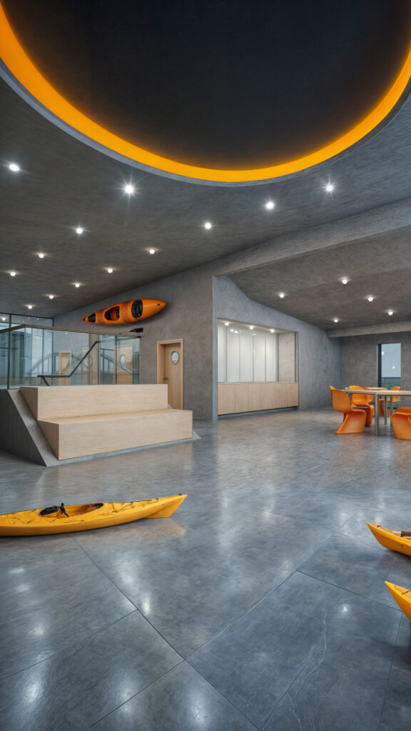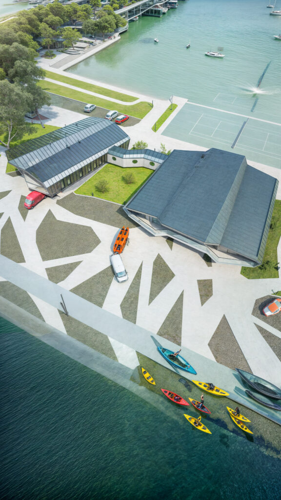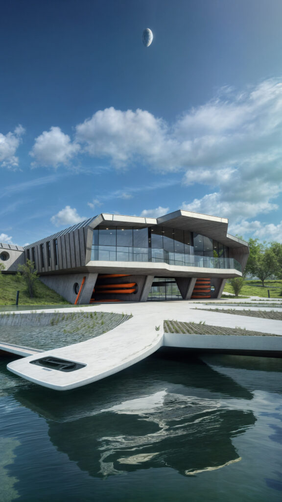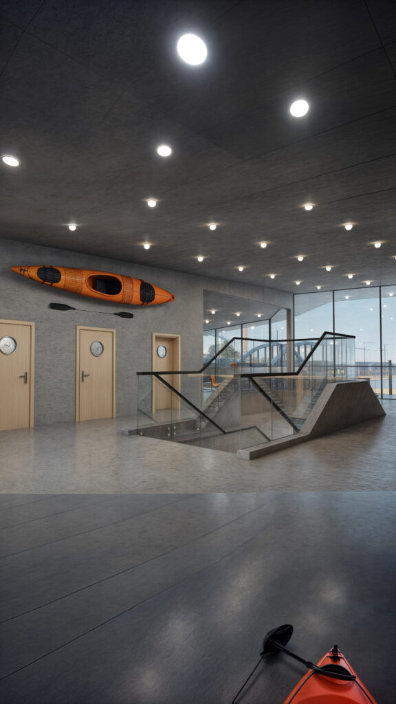 Przedstawiamy realistyczną wizualizację 3D nowoczesnej przystani kajakowej nad rzeką Wartą. Ujęcia z zewnątrz pokazują nowoczesny budynek przystani, widziany z góry, co podkreśla jego architekturę i położenie nad wodą. Wizualizacje wnętrza obejmują hol główny z nowoczesnymi, oszklonymi balustradami, które nadają przestrzeni elegancji i nowoczesności.