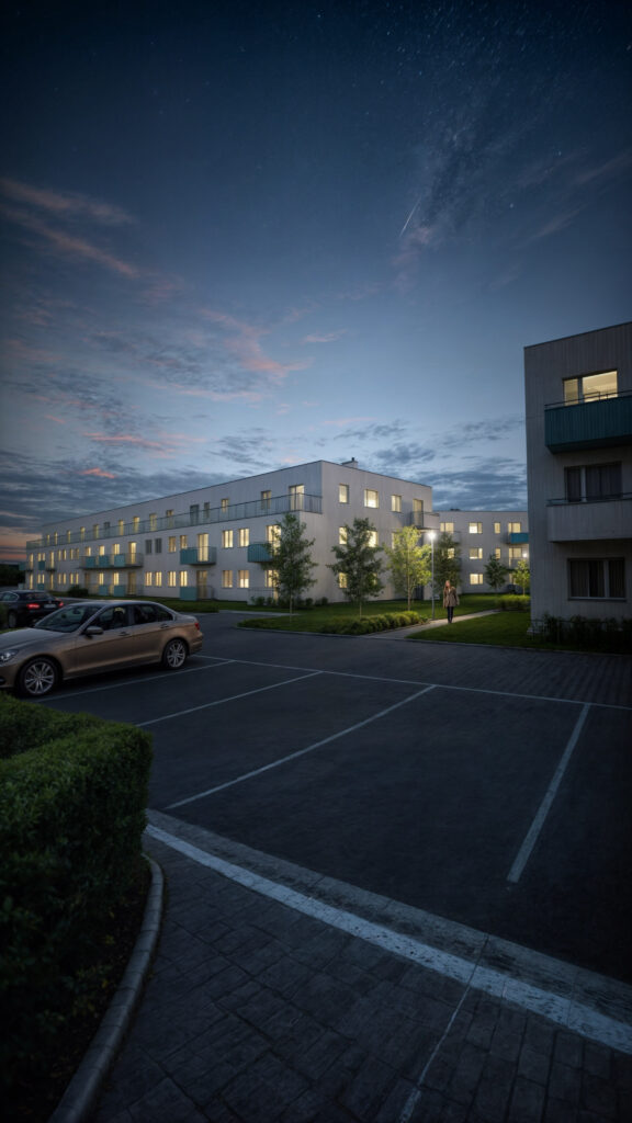 Realistyczna wizualizacja osiedla w Plewiskach dla dewelopera PAJO, ukazującą nowoczesną architekturę budynków mieszkalnych. Projekt zawiera zarówno ujęcia dzienne, które podkreślają otaczającą zieleń i przestrzeń rekreacyjną, jak i ujęcia wieczorne, ukazujące eleganckie oświetlenie oraz przytulny klimat osiedla. Dzięki wizualizacjom 3D, inwestorzy i przyszli mieszkańcy mogą dokładnie zobaczyć wszystkie detale i funkcjonalność przestrzeni.