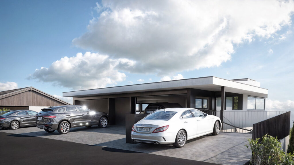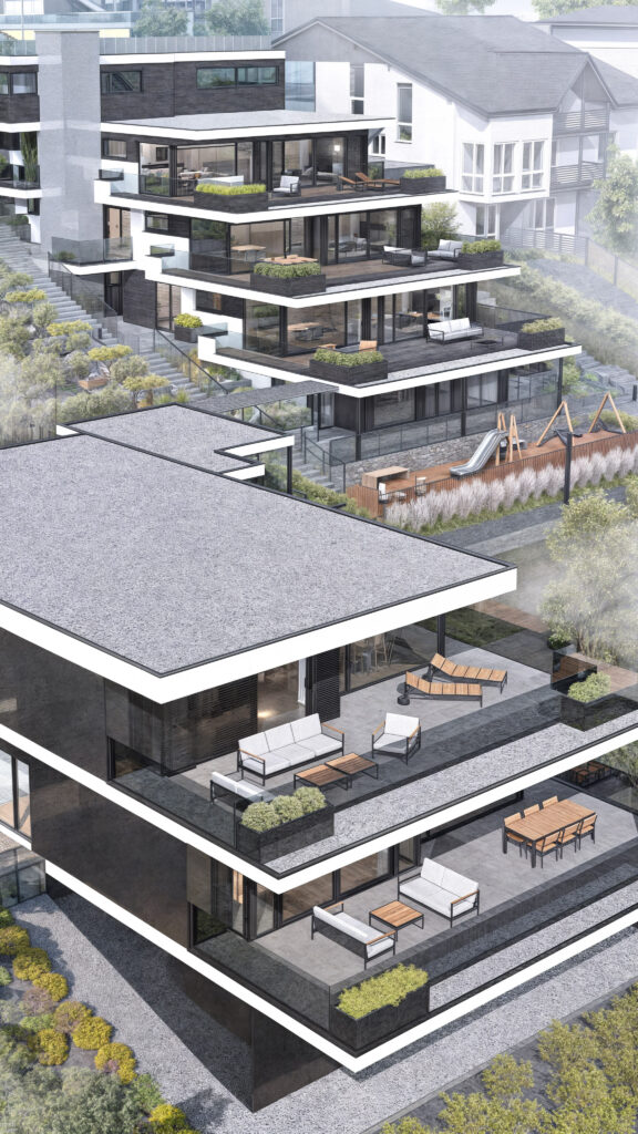 Wizualizacja zewnętrznej architektury projektu mieszkań tarasowych w Auenstein, Szwajcaria. Dzięki zaawansowanym wizualizacjom 3D inwestorzy mogą szczegółowo zobaczyć, jak bryła budynku harmonijnie wpisuje się w otoczenie. Dodatkowo, zastosowanie druku 3D pozwala na fizyczne odwzorowanie budynku, co daje inwestorom możliwość pełniejszego wyobrażenia sobie kształtu i proporcji obiektu oraz ocenę jego estetyki i funkcjonalności na etapie planowania. To niezwykle przydatne narzędzie, które pomaga w podejmowaniu bardziej świadomych decyzji projektowych.