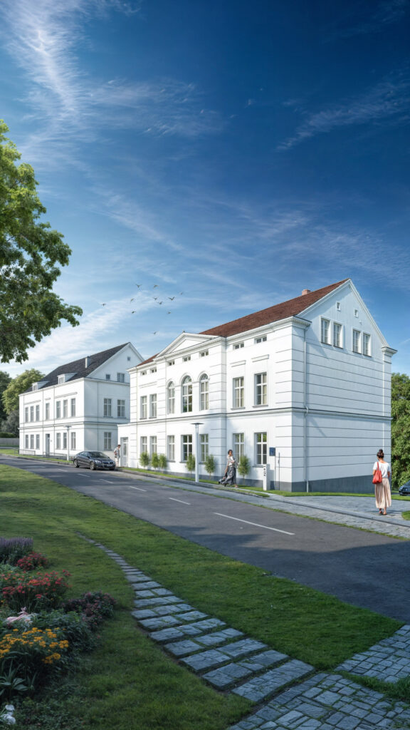Wizualizacje 3D kamienic mieszkalnych w Putbus, Niemcy. Nasze wizualizacje prezentują zarówno elegancką architekturę zewnętrzną, jak i starannie zaprojektowane wnętrza. Ujęcia z zewnątrz podkreślają klasyczny styl budynków, harmonijnie wpisujący się w otoczenie, natomiast wizualizacje wnętrz pokazują przestronne, funkcjonalne układy mieszkań. To idealna propozycja dla deweloperów i inwestorów poszukujących realistycznych prezentacji architektonicznych.