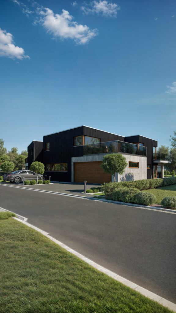 Wizualizacja nowoczesnych czarnych domów bliźniaczych zlokalizowanych w Endingen, Szwajcaria. Nasze fotorealistyczne wizualizacje ukazują elegancki design budynków, wyróżniający się odważną, minimalistyczną architekturą oraz dużymi przeszkleniami. Połączenie czarnej elewacji z nowoczesnymi formami nadaje projektowi wyjątkowy, prestiżowy charakter, idealny dla osób ceniących nowoczesność i elegancję.