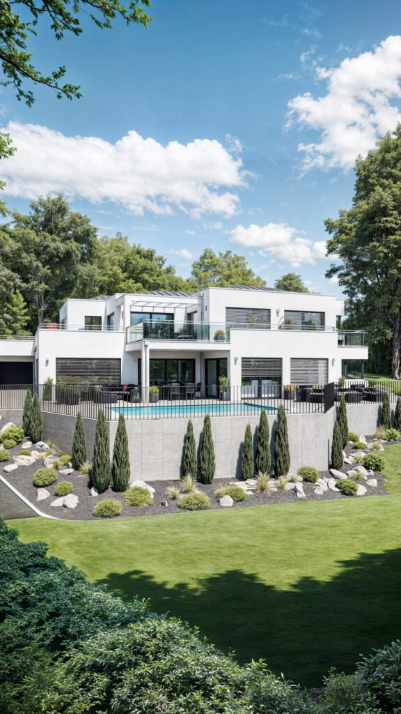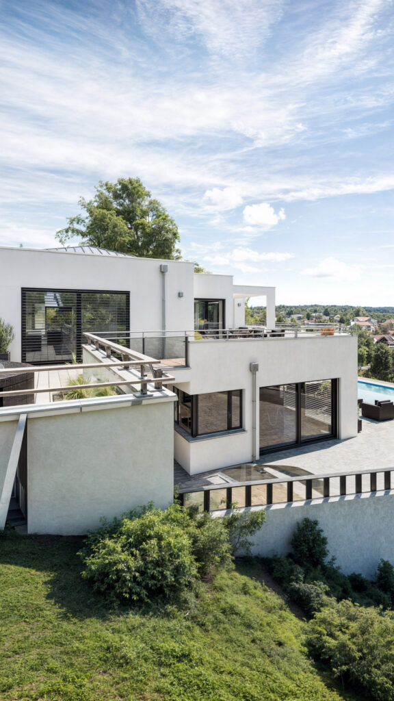 Prezentujemy wizualizację nowoczesnej willi z widokiem w Ramlinsburg, Homberg, Szwajcaria. Willa wyróżnia się eleganckim, nowoczesnym designem, dużymi przeszkleniami oraz przestronnymi tarasami z basenem, które oferują zapierające dech w piersiach widoki na okoliczne wzgórza. Projekt łączy luksus z nowoczesnymi rozwiązaniami architektonicznymi, zapewniając komfort i prestiż w wyjątkowym otoczeniu.