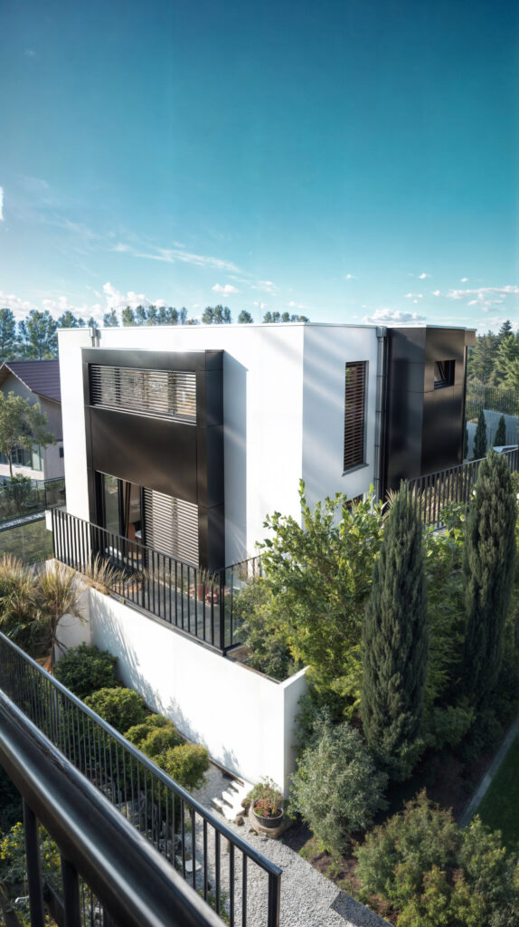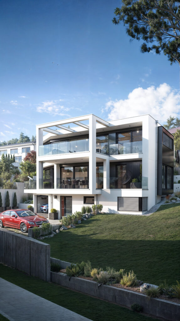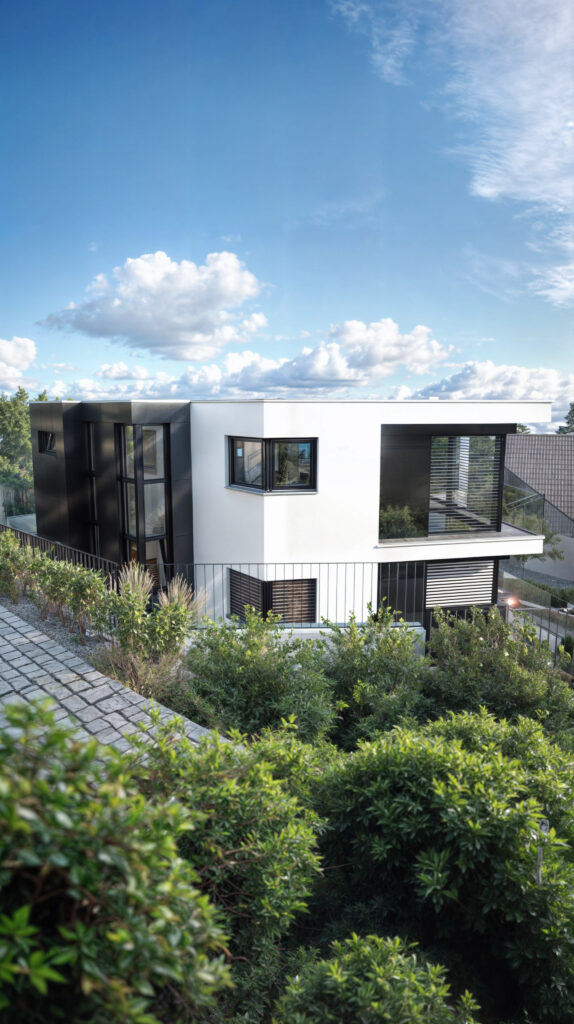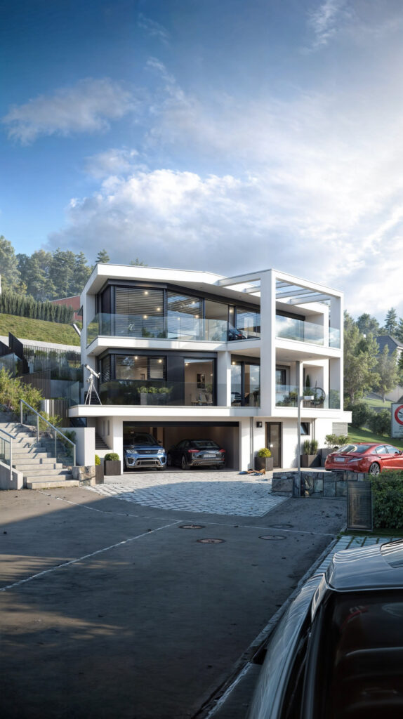 Prezentujemy wizualizację nowoczesnego domu z tarasami w Biberstein, Im Trottenacker, Szwajcaria. Budynek wyróżnia się nowoczesnym designem oraz zielonym dachem pokrytym trawą, który zapewnia nie tylko estetyczny wygląd, ale także korzyści ekologiczne. Nasze fotorealistyczne wizualizacje ukazują przestronne tarasy oraz unikalne połączenie architektury z naturalnym otoczeniem, tworząc idealne miejsce do życia dla osób ceniących nowoczesne rozwiązania i bliskość natury.