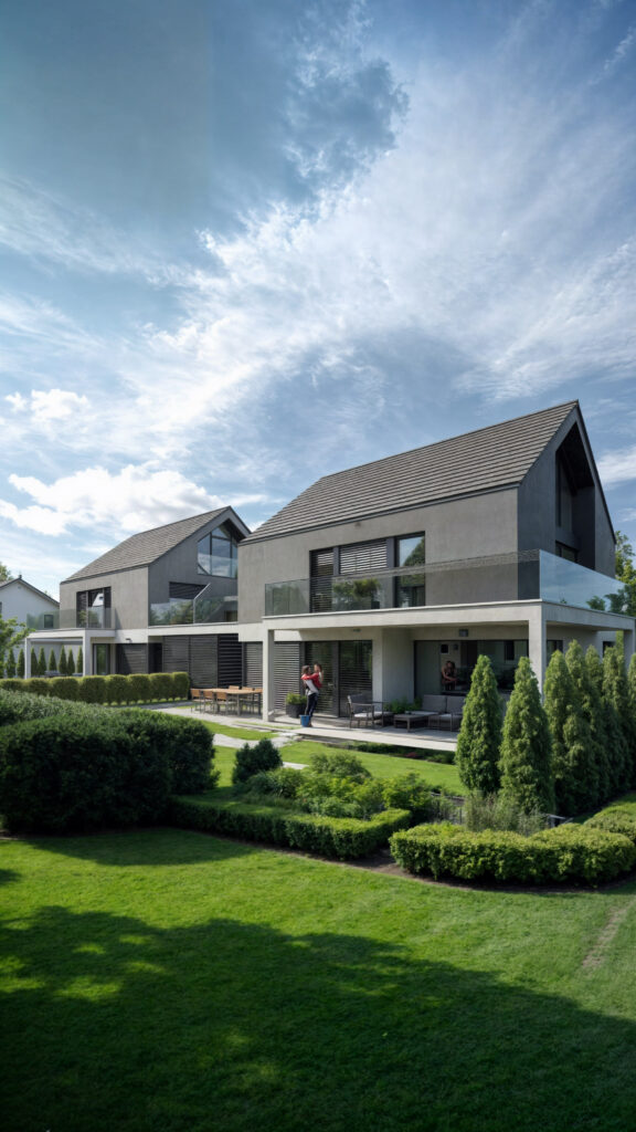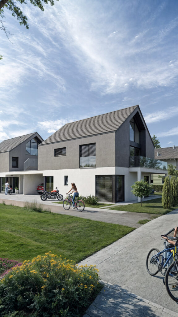 Przedstawiamy wyjątkowe wizualizacje 3D dwóch nietypowych domów jednorodzinnych w Ziefen, Szwajcaria. Te eleganckie bliźniaki w nowoczesnym stylu charakteryzują się szaro-białą kolorystyką, minimalistyczną bryłą oraz przestronnymi ogrodami, które tworzą idealną przestrzeń do życia. Wizualizacje ukazują zarówno nowoczesną architekturę budynków, jak i starannie zaprojektowane otoczenie, które doskonale wkomponowuje się w krajobraz Ziefen.