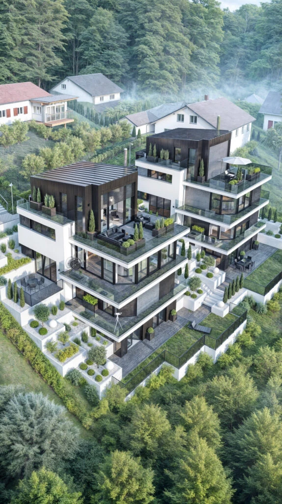 Prezentujemy wizualizację dwóch nowoczesnych domów zlokalizowanych w Unterkulm, Szwajcaria. Budynki wyróżniają się elegancką architekturą oraz efektownymi penthousami na dachu. Wizualizacje przedstawiają wieczorne oświetlenie, które podkreśla ich nowoczesny charakter, widok z lotu ptaka oraz architekturę z zewnątrz. Nasze fotorealistyczne wizualizacje ukazują wyjątkowe połączenie estetyki i funkcjonalności, tworząc harmonijną przestrzeń idealną do życia.