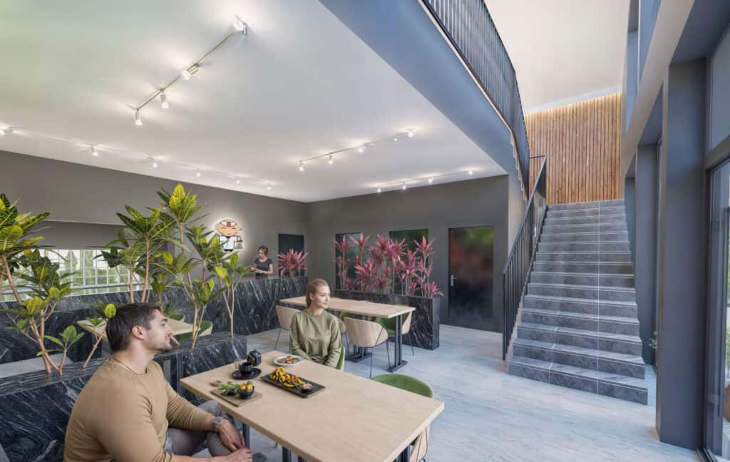 Nowoczesna koncepcja bryły zewnętrznej z naciskiem na integrację wnętrza. Mieliśmy przyjemność stworzyć kompleksowe wizualizacje baru sushi w Lesznie, które obejmowały zarówno wnętrze lokalu, jak i jego zewnętrzną elewację. Projekt został wykonany w ścisłej współpracy z klientem, aby w pełni oddać jego wizję oraz potrzeby funkcjonalne i estetyczne. Naszym celem było stworzenie przestrzeni, która łączy nowoczesny design z subtelnymi akcentami inspirowanymi kulturą japońską.