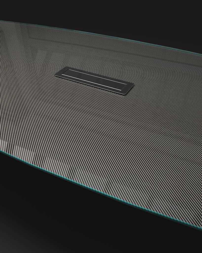 W ujęciach skupiono się na detalach powierzchni — odbiciach światła, głębi struktury włókna oraz subtelnym przejściu tonów między szkłem a karbonem. Każda wizualizacja oddaje lekkość materiału w kontraście z jego wytrzymałością, tworząc spójną kompozycję idealną dla nowoczesnych przestrzeni biurowych i domowych gabinetów.