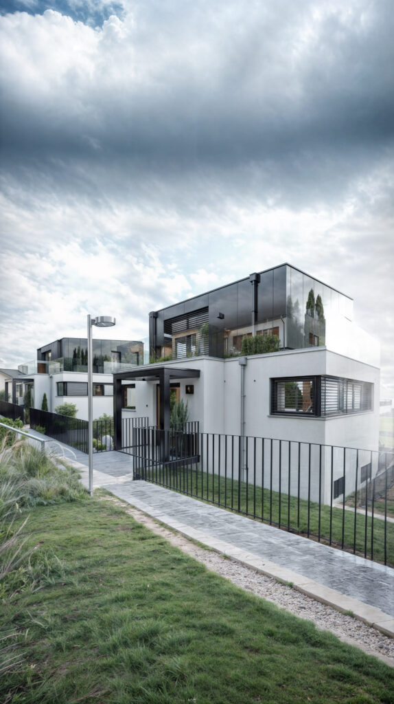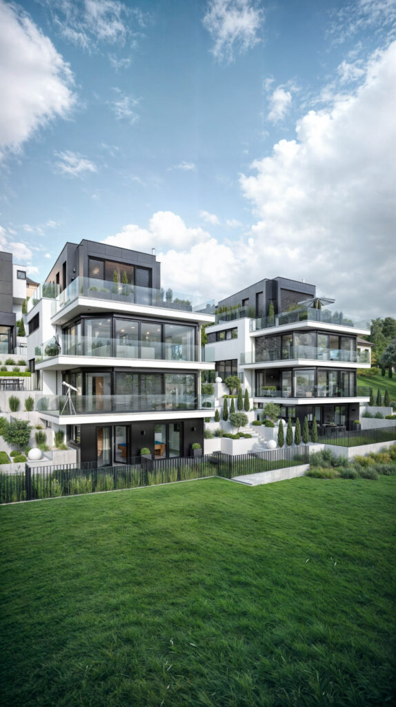 Prezentujemy wizualizację dwóch nowoczesnych domów zlokalizowanych w Unterkulm, Szwajcaria. Budynki wyróżniają się elegancką architekturą oraz efektownymi penthousami na dachu. Wizualizacje przedstawiają wieczorne oświetlenie, które podkreśla ich nowoczesny charakter, widok z lotu ptaka oraz architekturę z zewnątrz. Nasze fotorealistyczne wizualizacje ukazują wyjątkowe połączenie estetyki i funkcjonalności, tworząc harmonijną przestrzeń idealną do życia.