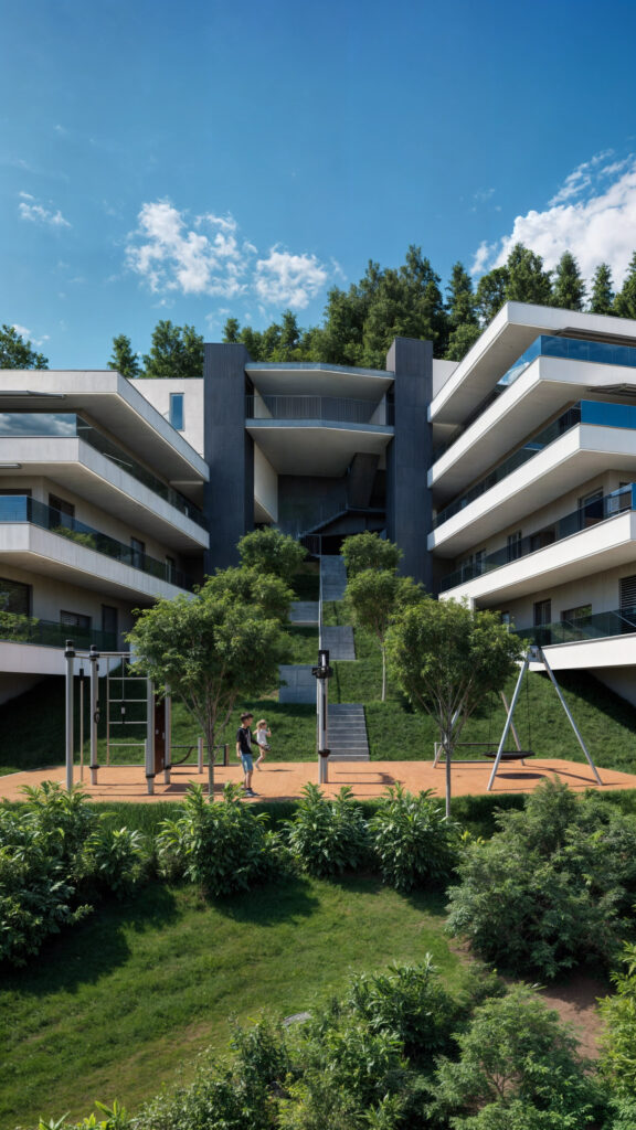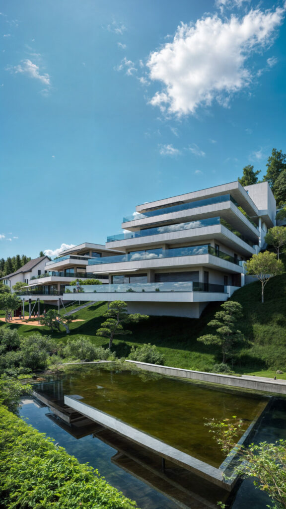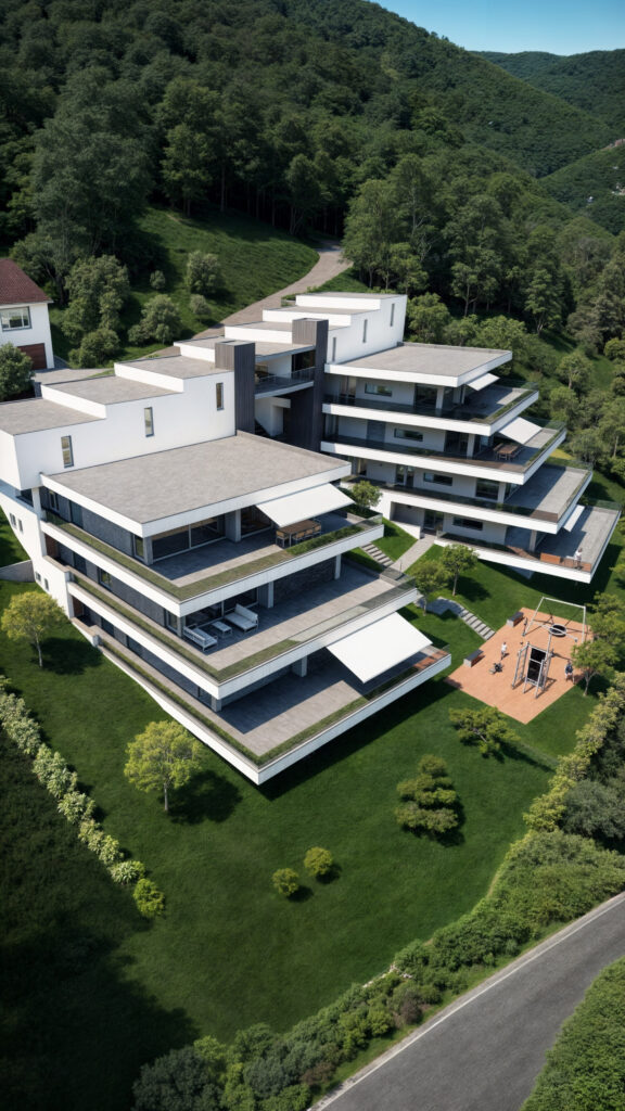 Projekt ten łączy nowoczesną architekturę z wyjątkową lokalizacją, oferując przestronne apartamenty z tarasami, które zapewniają zapierające dech w piersiach widoki na otaczający krajobraz. Wizualizacje ukazują elegancki design budynku, dużą ilość naturalnego światła oraz doskonałe połączenie wnętrz z przestrzeniami zewnętrznymi, tworząc idealne miejsce do życia w zgodzie z naturą.