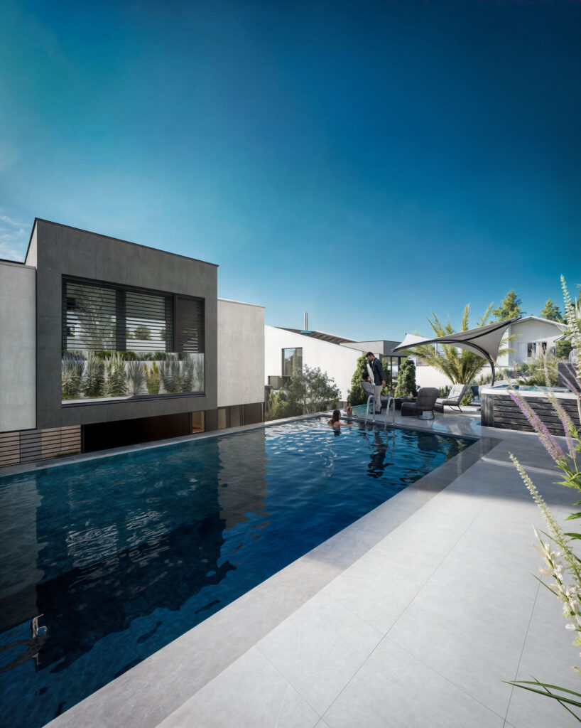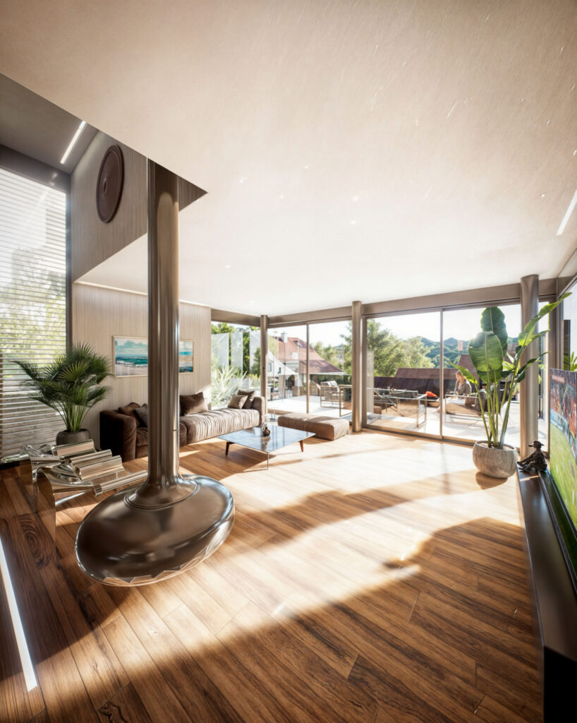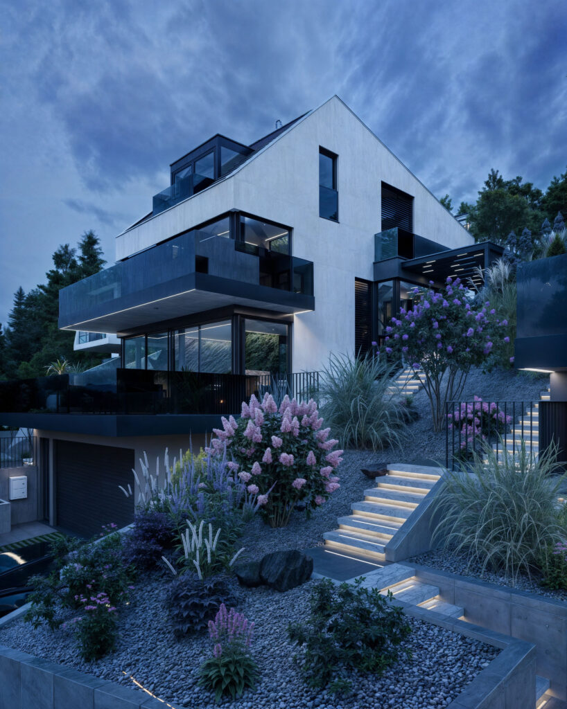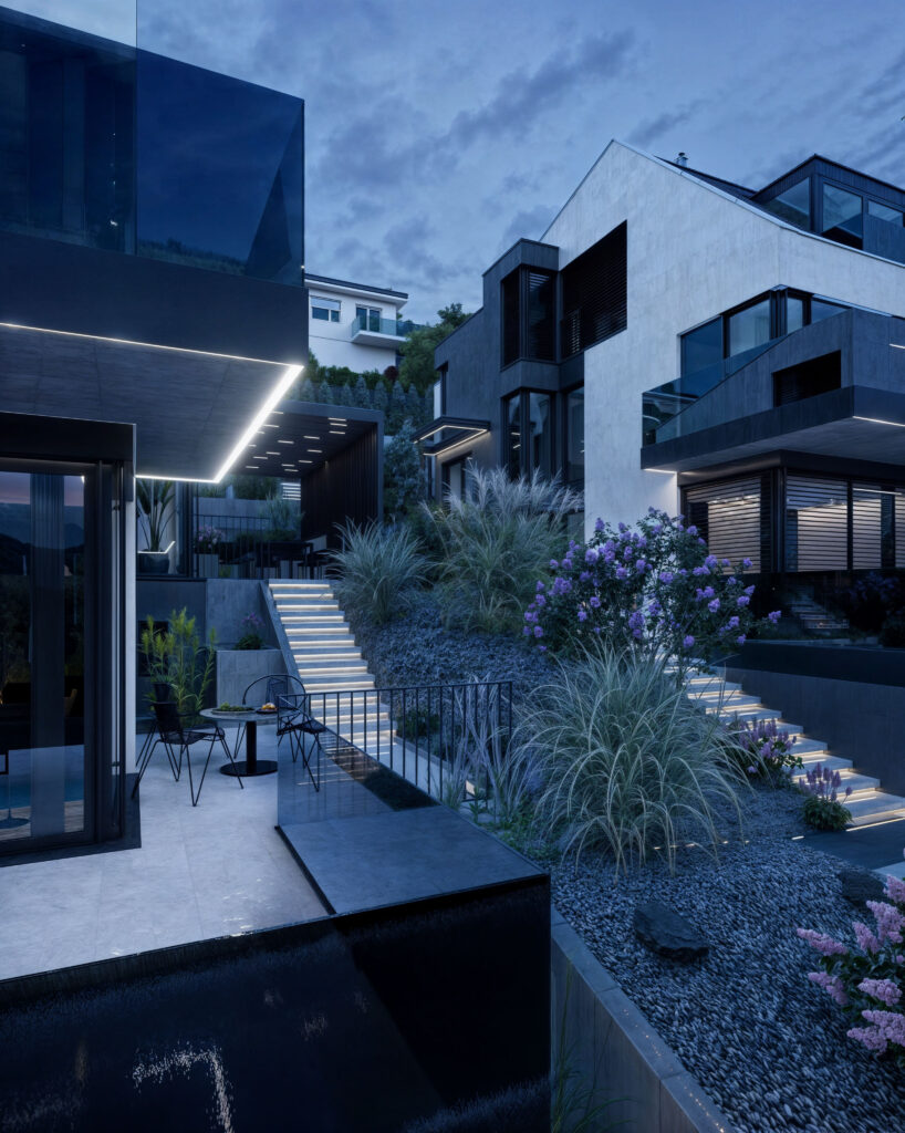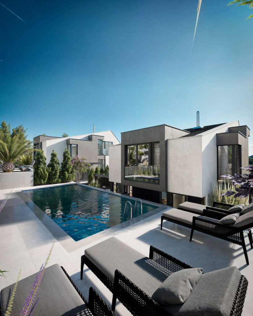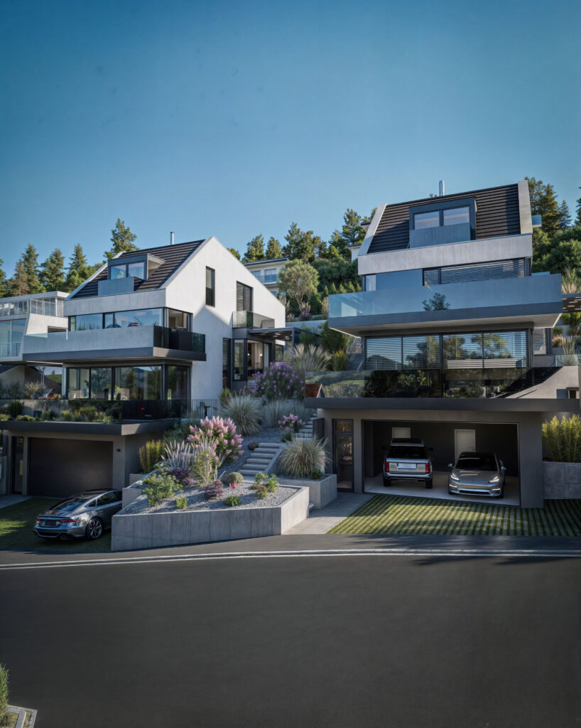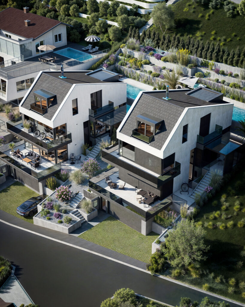 Prezentujemy wizualizacje 3D dwóch ekskluzywnych budynków jednorodzinnych w Muttenz, Szwajcaria, które ukazują nowoczesną architekturę i elegancję w każdym detalu. Projekt obejmuje realistyczne ujęcia zewnętrzne zarówno w dziennym, jak i wieczornym oświetleniu, co pozwala zobaczyć, jak budynki harmonijnie wkomponowują się w otaczający krajobraz o różnych porach dnia. Przestronne tarasy, nowoczesne wykończenia oraz duże przeszklenia tworzą efektowne połączenie z naturalnym otoczeniem.