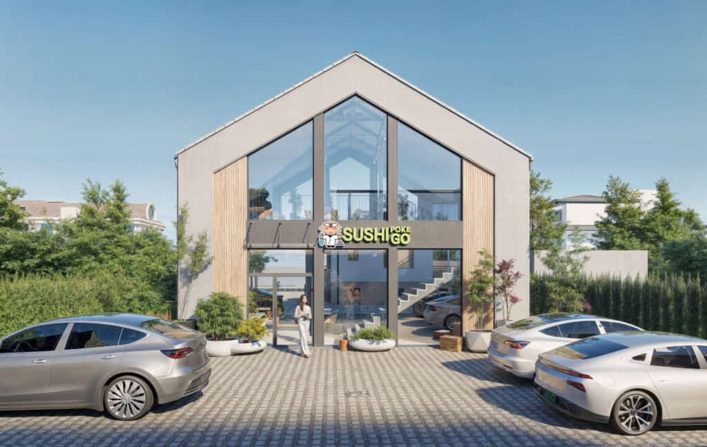 Nowoczesna koncepcja bryły zewnętrznej z naciskiem na integrację wnętrza. Mieliśmy przyjemność stworzyć kompleksowe wizualizacje baru sushi w Lesznie, które obejmowały zarówno wnętrze lokalu, jak i jego zewnętrzną elewację. Projekt został wykonany w ścisłej współpracy z klientem, aby w pełni oddać jego wizję oraz potrzeby funkcjonalne i estetyczne. Naszym celem było stworzenie przestrzeni, która łączy nowoczesny design z subtelnymi akcentami inspirowanymi kulturą japońską.